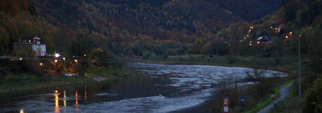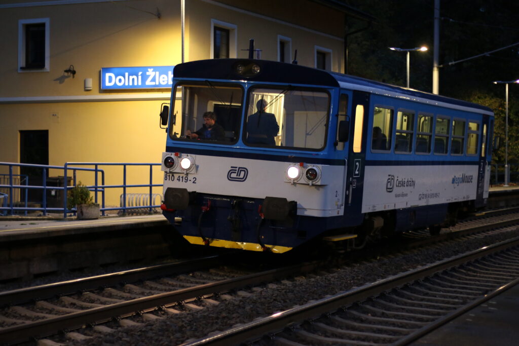 Als Belohnung winkt die Fahrt mit der Retro-Brotbüchse von KŽC auf der Ziegenbahn in den Ausläufern des Elbsandsteingebirges zurück nach Děčín. Da die U28 immer noch nicht fährt, wartet eine weitere Besonderheit auf uns: Eine ČD-Brotbüchse pendelt im Elbtal nach Dolní Žleb. Anstatt wieder nach Děčín zurückzufahren, wagen wir das Experiment, vor Ort nach einer Gelegenheit zum Abendessen zu suchen. Laut Karte sollen mehrere Gaststätten geöffnet sein. In der Nacht zum Sonntag wurden die Uhren umgestellt und so ist es um fünf Uhr am Elberadweg schon recht dunkel und kühl – keine anderen Touristen weit und breit. Und so überrascht es wenig, dass die Gaststätten, die wir abklappern, doch nicht geöffnet haben. Letzte Chance: das Gasthaus, das am weitesten vom Radweg entfernt liegt. Und wir haben Glück, bei U Kosti brennt noch Licht und man nimmt uns gerne auf. So können wir den Ausflug mit böhmischen Spezialitäten in gemütlicher Atmosphäre abrunden. Mittlerweile sind auch die Bauarbeiten im Elbtal so weit beendet und wir treten mit U28 und S1 die Rückfahrt nach Dresden an.