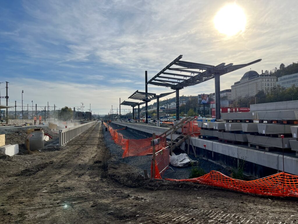 Um 12 Uhr steht gleich unser erster Termin an. Der Infrastrukturbetreiber Správa železnic lädt uns ein, die Baustelle am Bahnhof Praha-Smíchov zu besichtigen. Im alten Empfangsgebäude aus den 1950ern erläutert ein Mitarbeiter von Hochtief CZ das Bauprojekt „Terminal Smíchov“. Seit 2024 wird der Bahnhof umfassend modernisiert. Dabei sind zunächst die nördlichen Bahnsteige und die Abstellanlagen von Regiojet verschwunden. Im Rahmen der Modernisierung werden die Bahnsteige erneuert und Unterführungen mit Aufzügen eingebaut. Das alte Bahnhofsgebäude wird teilweise in einen Neubau integriert. Oben auf dem Neubau entsteht ein Busbahnhof. Brücken verbinden die Stadtteile auf beiden Seiten des Bahngeländes. Am Ende soll die ganze Anlage überdacht werden. Auf dem angrenzenden Gelände des ehemaligen Güterbahnhofs entsteht mit Smíchov City ein neues Stadtviertel. Zum Zeitpunkt unseres Besuchs laufen gerade Hoch- und Tiefbauarbeiten an den Bahnsteigsanlagen. Wir können die Unterführungen und Brücken im Rohbau besichtigen. Der Bau der Bahnsteigabschnitte, die im Süden außerhalb der Halle liegen werden, ist schon weit fortgeschritten. Während der Modernisierungen läuft der Zugverkehr in reduziertem Umfang weiter.