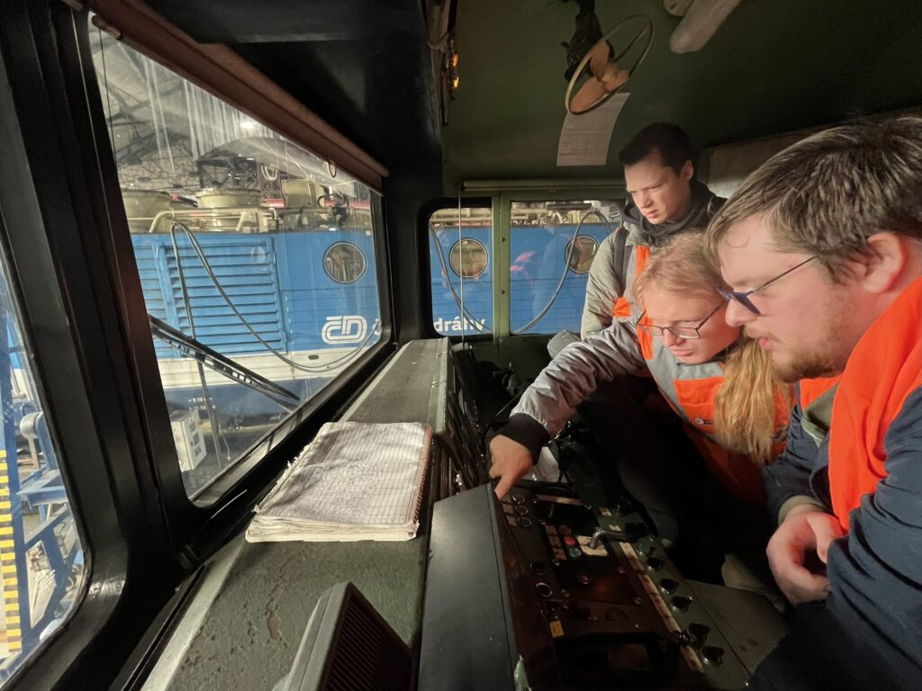 Am Samstagmorgen können wir dank persönlicher Kontakte einen Blick ins Depot Praha-Vršovice werfen. In zwei großen Ringlokschuppen stehen bunt gemischt alle möglichen modernen und alten Lokomotiven, die rund um Prag zum Einsatz kommen. Besonders farbenfroh zeigen sich Dieselloks wie die bekannten „Taucherbrillen“ oder „Bardotka“, die unter anderem im Ausflugsverkehr noch eingesetzt werden. Auch die ein oder andere Brotbüchse steht im Schuppen. Einige Arbeitsstände sind an Siemens vermietet für die Wartung der Vectrons. In der angeschlossenen Werkstatt können im Rahmen von Open Access auch andere Betreiber neben der Staatsbahn ihre Züge warten lassen. Auf dem Außengelände rund um die zwei Drehscheiben warten zahlreiche fabrikneue 230km/h-Vectrons auf ihre ersten Einsätze. Gleichzeitig blicken Škoda-Loks der Baureihe 151 und auch der recht jungen 380-Serie im Licht der Einführung von ETCS auf den Hauptstrecken einer unsicheren Zukunft entgegen. Unter fachkundiger Anleitung dürfen wir zahlreiche Führerstände, Maschinenräume, Untersuchungsgruben und Dacharbeitsstände besichtigen. Nach gut zweieinhalb Stunden haben wir so ziemlich alles gesehen.