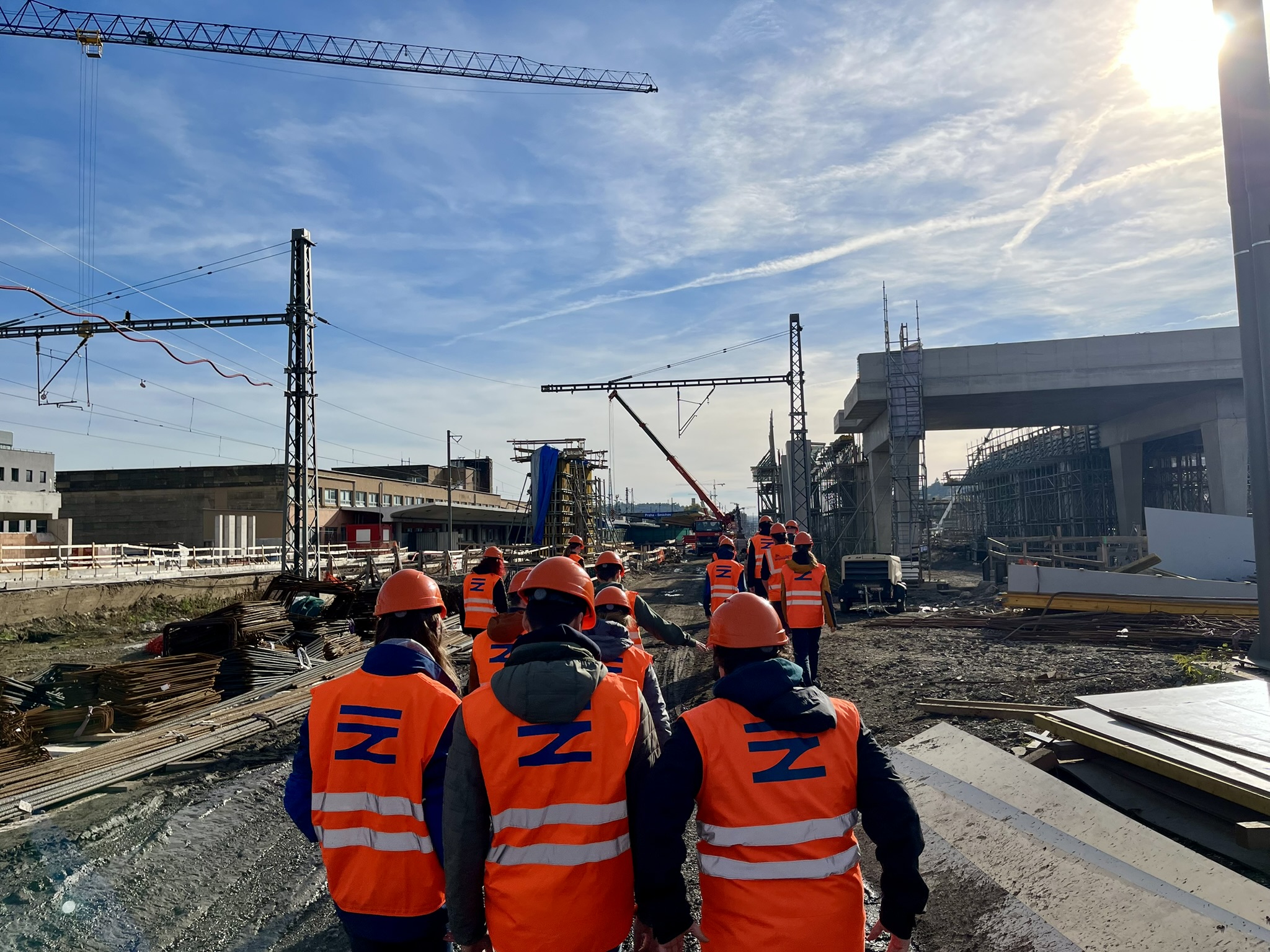 Um 12 Uhr steht gleich unser erster Termin an. Der Infrastrukturbetreiber Správa železnic lädt uns ein, die Baustelle am Bahnhof Praha-Smíchov zu besichtigen. Im alten Empfangsgebäude aus den 1950ern erläutert ein Mitarbeiter von Hochtief CZ das Bauprojekt „Terminal Smíchov“. Seit 2024 wird der Bahnhof umfassend modernisiert. Dabei sind zunächst die nördlichen Bahnsteige und die Abstellanlagen von Regiojet verschwunden. Im Rahmen der Modernisierung werden die Bahnsteige erneuert und Unterführungen mit Aufzügen eingebaut. Das alte Bahnhofsgebäude wird teilweise in einen Neubau integriert. Oben auf dem Neubau entsteht ein Busbahnhof. Brücken verbinden die Stadtteile auf beiden Seiten des Bahngeländes. Am Ende soll die ganze Anlage überdacht werden. Auf dem angrenzenden Gelände des ehemaligen Güterbahnhofs entsteht mit Smíchov City ein neues Stadtviertel. Zum Zeitpunkt unseres Besuchs laufen gerade Hoch- und Tiefbauarbeiten an den Bahnsteigsanlagen. Wir können die Unterführungen und Brücken im Rohbau besichtigen. Der Bau der Bahnsteigabschnitte, die im Süden außerhalb der Halle liegen werden, ist schon weit fortgeschritten. Während der Modernisierungen läuft der Zugverkehr in reduziertem Umfang weiter.