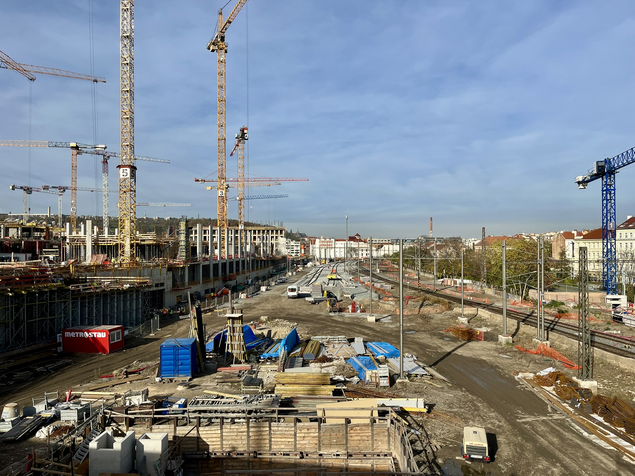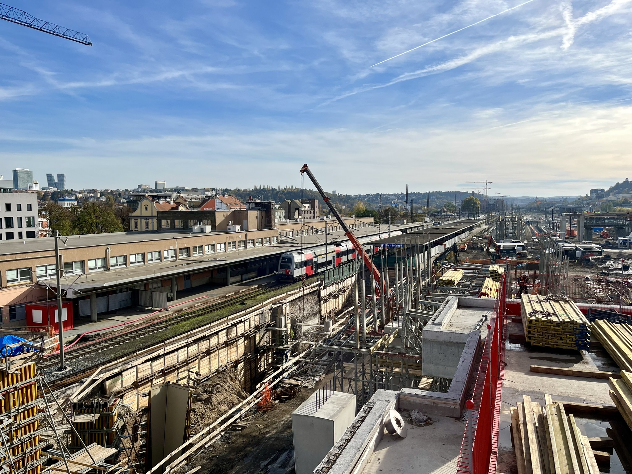 Aus Richtung Hauptbahnhof reicht der Gleisbau bis an die Baustelle heran. Links entsteht Smíchov City.