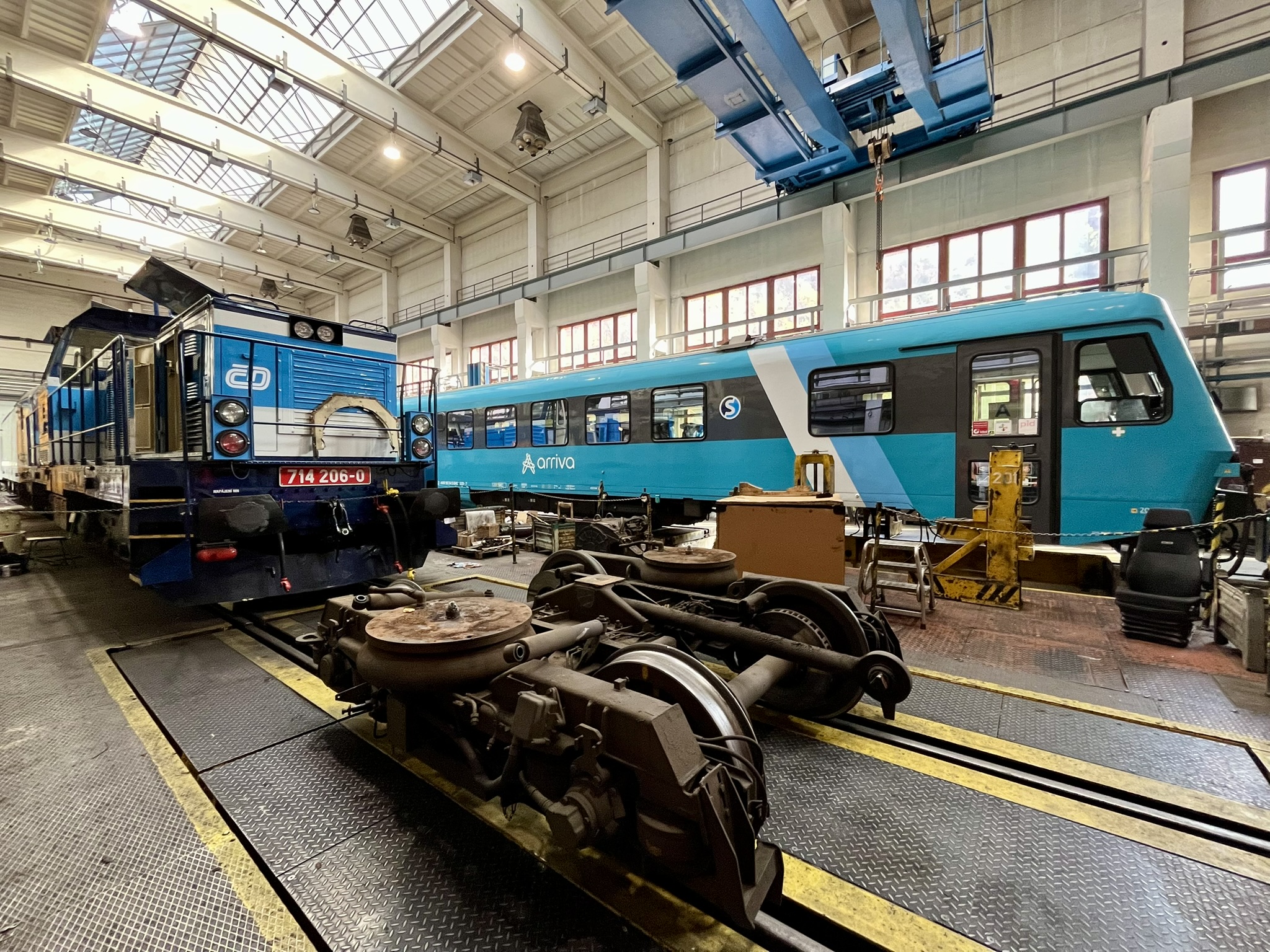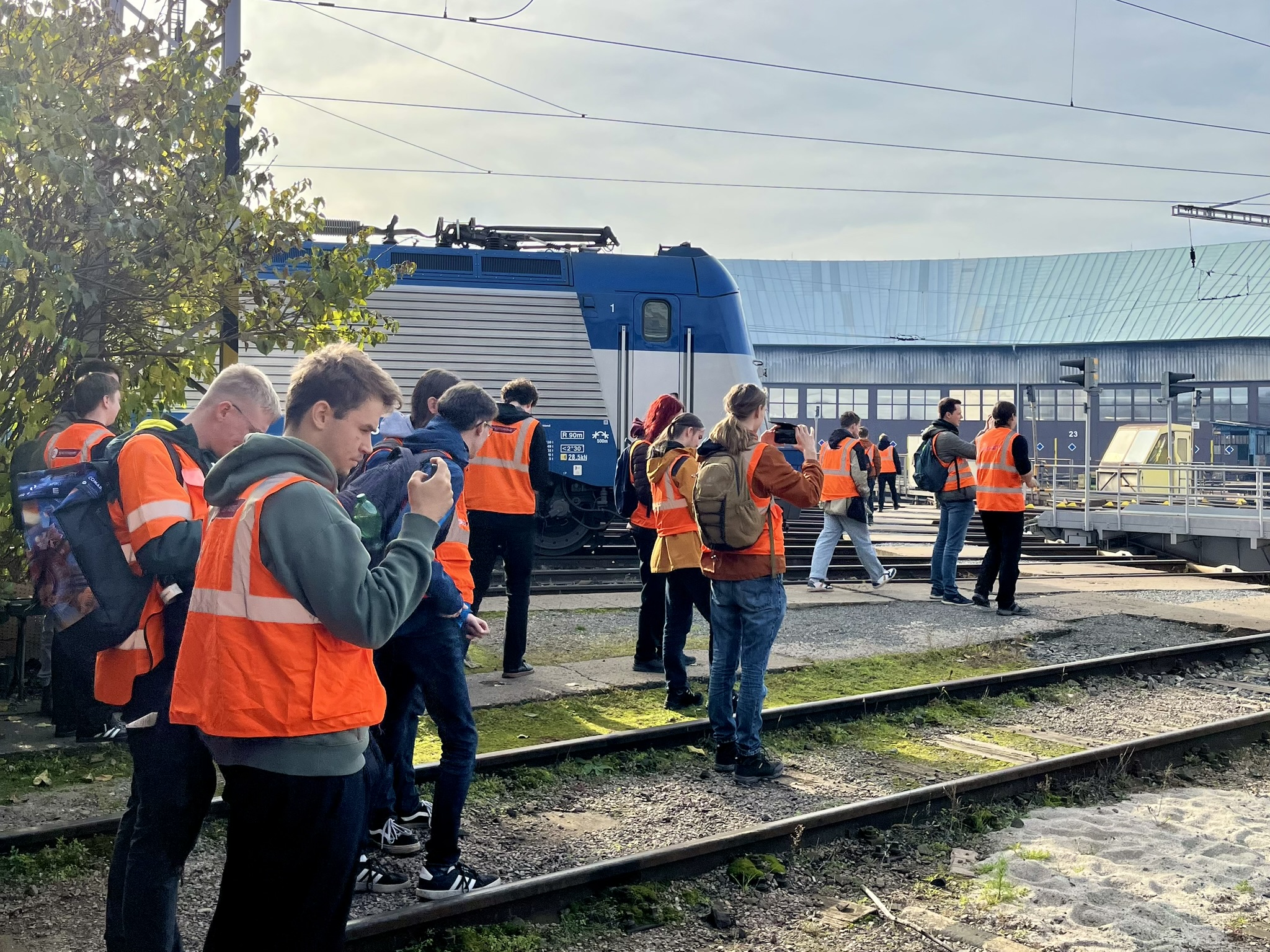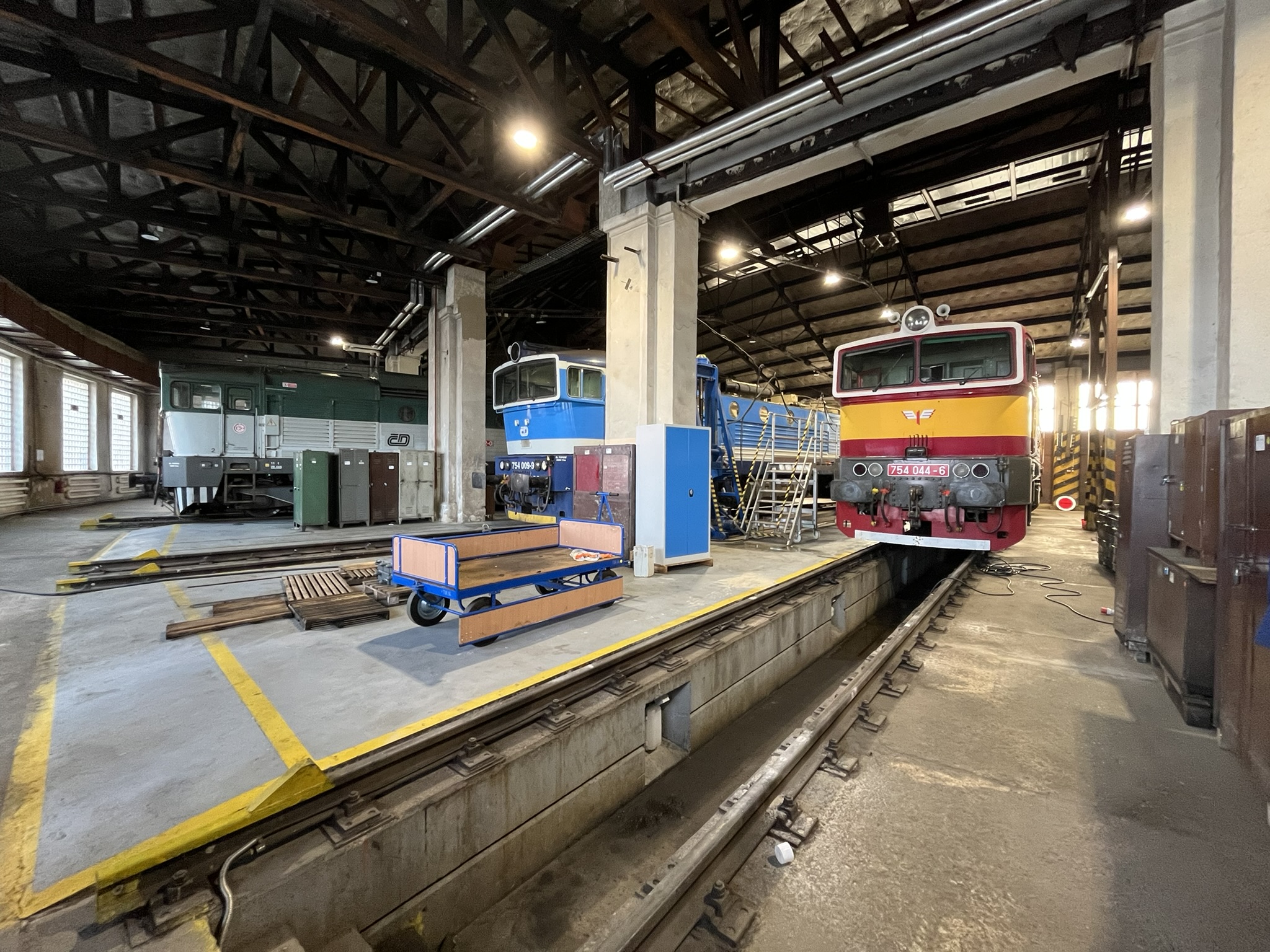 Am Samstagmorgen können wir dank persönlicher Kontakte einen Blick ins Depot Praha-Vršovice werfen. In zwei großen Ringlokschuppen stehen bunt gemischt alle möglichen modernen und alten Lokomotiven, die rund um Prag zum Einsatz kommen. Besonders farbenfroh zeigen sich Dieselloks wie die bekannten „Taucherbrillen“ oder „Bardotka“, die unter anderem im Ausflugsverkehr noch eingesetzt werden. Auch die ein oder andere Brotbüchse steht im Schuppen. Einige Arbeitsstände sind an Siemens vermietet für die Wartung der Vectrons. In der angeschlossenen Werkstatt können im Rahmen von Open Access auch andere Betreiber neben der Staatsbahn ihre Züge warten lassen. Auf dem Außengelände rund um die zwei Drehscheiben warten zahlreiche fabrikneue 230km/h-Vectrons auf ihre ersten Einsätze. Gleichzeitig blicken Škoda-Loks der Baureihe 151 und auch der recht jungen 380-Serie im Licht der Einführung von ETCS auf den Hauptstrecken einer unsicheren Zukunft entgegen. Unter fachkundiger Anleitung dürfen wir zahlreiche Führerstände, Maschinenräume, Untersuchungsgruben und Dacharbeitsstände besichtigen. Nach gut zweieinhalb Stunden haben wir so ziemlich alles gesehen.